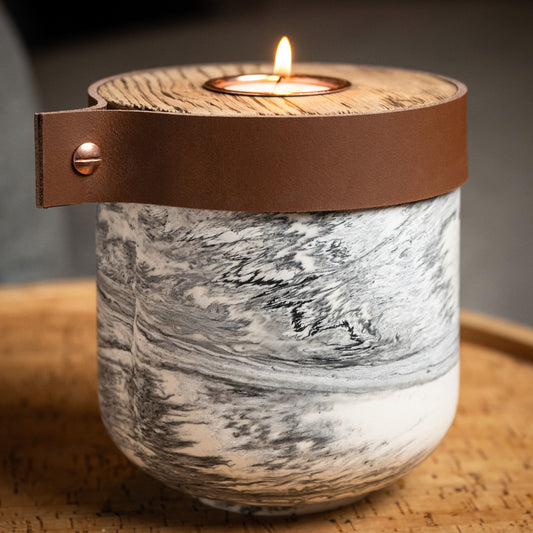 Human or Pet Urn for Cremation Ashes, Small Size, Grey Marble Jesmonite with Cognac Leather, Personalise