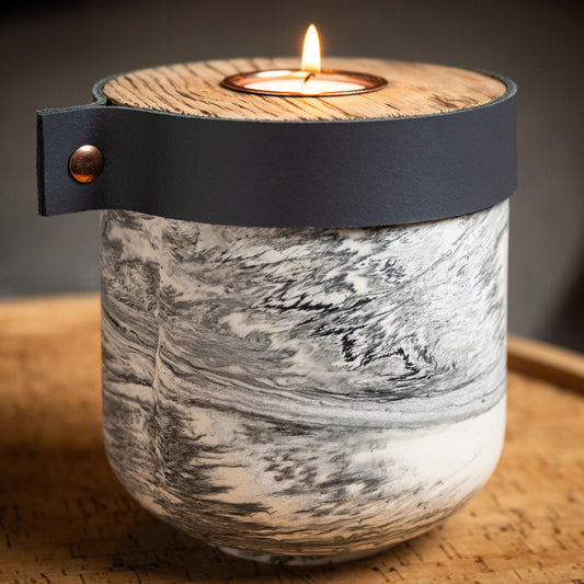 Human or Pet Urn for Cremation Ashes, Small Size, Grey Marble Jesmonite with Smoke Grey Leather, Personalise