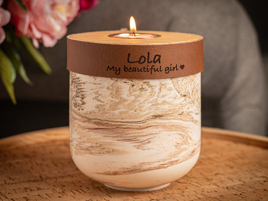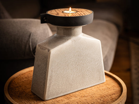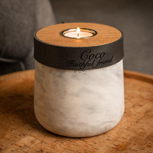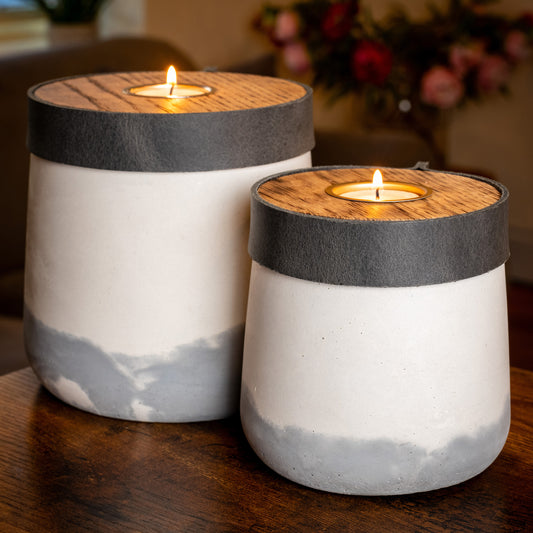 Handmade Human or Pet Cremation Urn: Medium Size, Concrete Two-Tone, Oak Candle Lid, Personalized Grey Leather