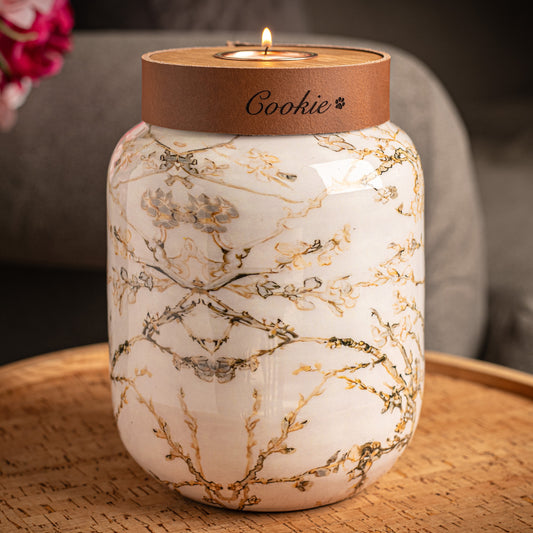 Floral Cremation Human or Pet Urn: Cognac Leather Band, Personalizable, Holds 85kg Pre Cremation weight