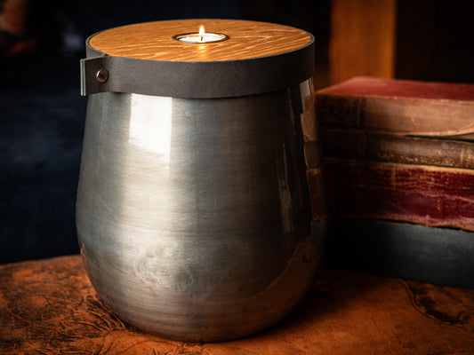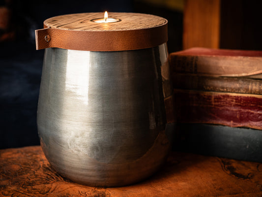 XL Companion Urn: Antique Pewter Finish, Cognac Leather Trim, Personalizable