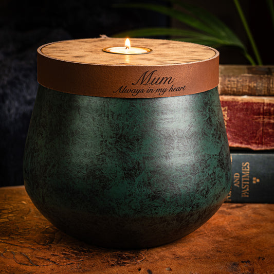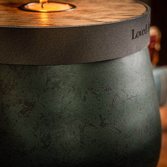 Emerald Green Cremation Urn: Smoke Grey Leather, Personalised Engraving