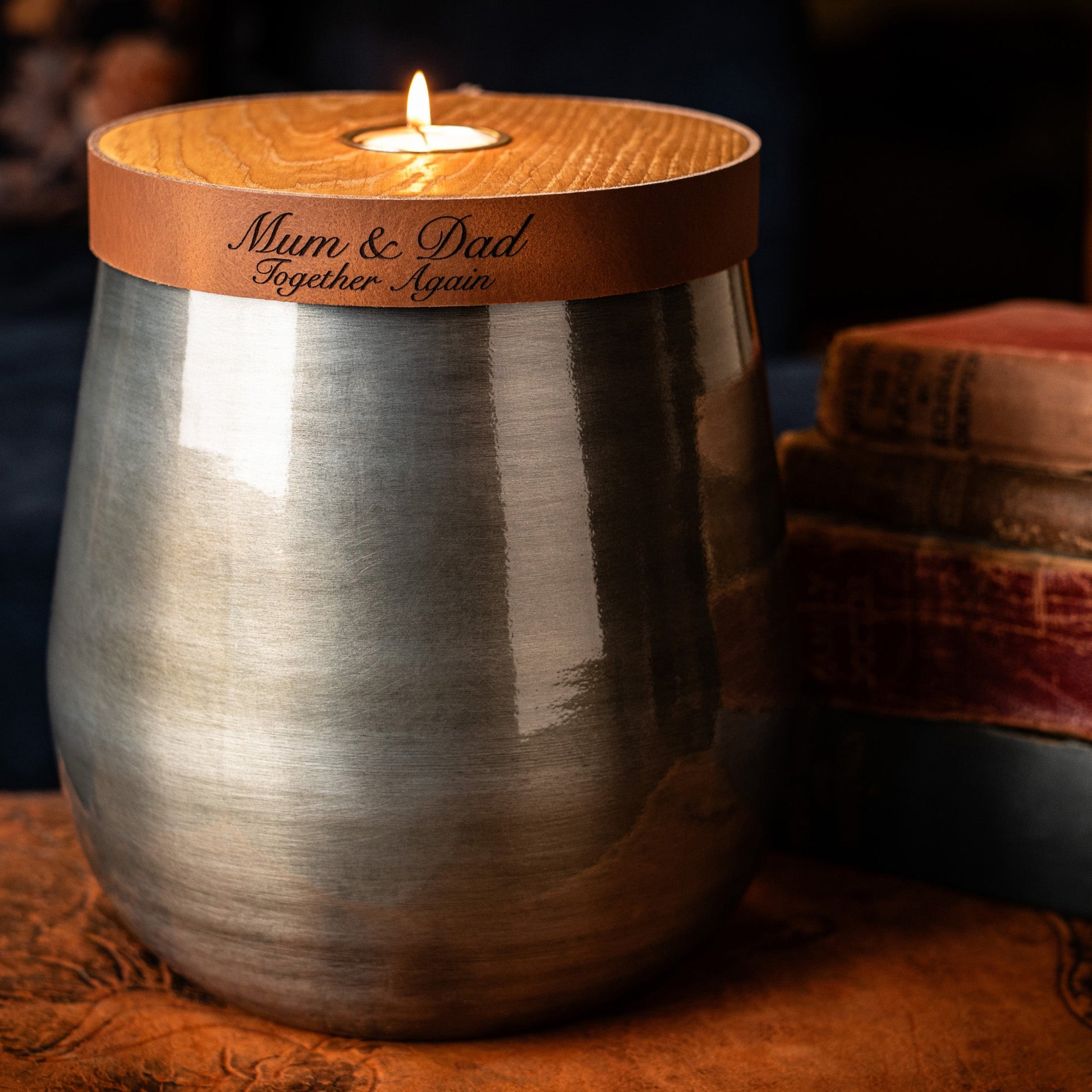 A stunning XL antique pewter finish companion candle urn for two sets of human ashes, complimented with a cognac brown leather trim.