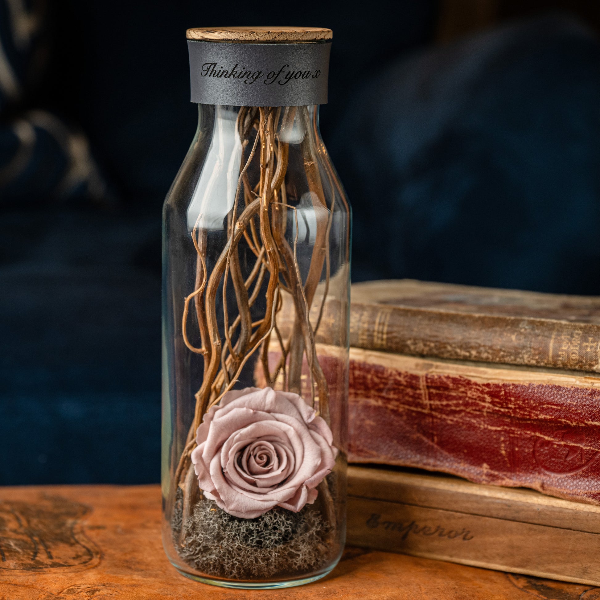 Preserved Vintage Nude Rose, Glass Vessel, Natural Materials, Cognac Brown Personalised Leather, Sentiment Gift